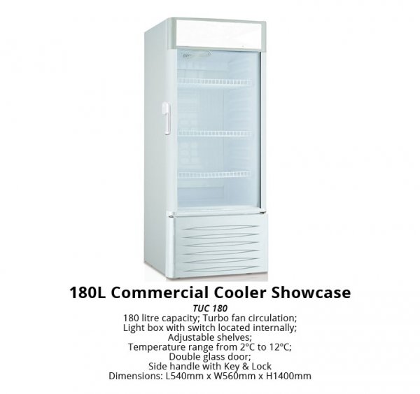 180 litre capacity; Turbo fan circulation; Light box with switch located internally; Adjustable shelves; Temperature range from 2ºC to 12ºC; Double glass door; Side handle with Key & Lock